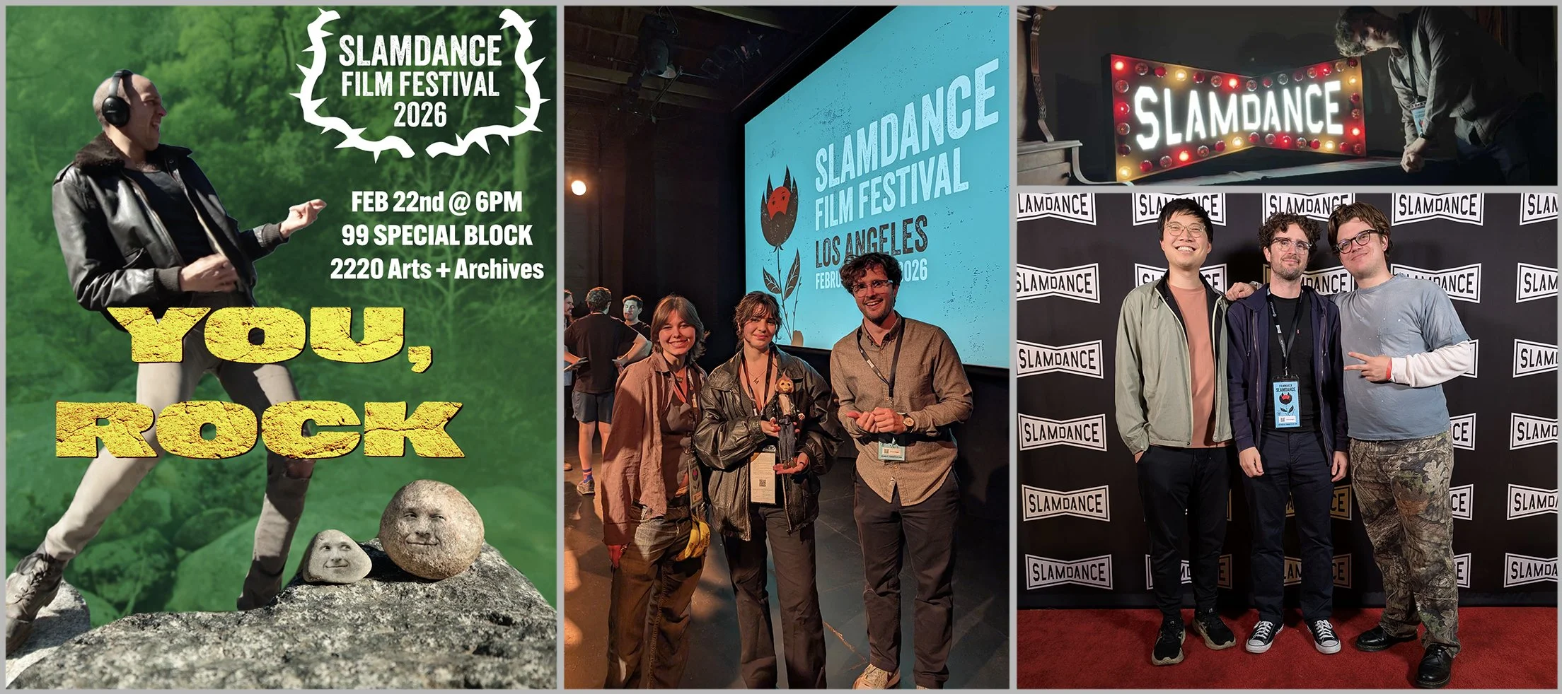 I still can’t believe You, Rock played at the 2026 Slamdance Film Festival. It was by far the highest caliber fest I’ve ever been included in. All the films were amazing, the filmmakers very approachable, and incredibly well run. It was truly filmmaker focused and really inspired me for this year’s Hemet Fest. I made some new friends (pictured below) and was in excellent company with the 99 Special Block where all films were under 99 seconds.